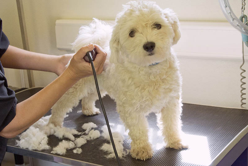 Alt: Chó Poodle trắng với bộ lông xoăn đang được chải chuốt.